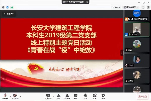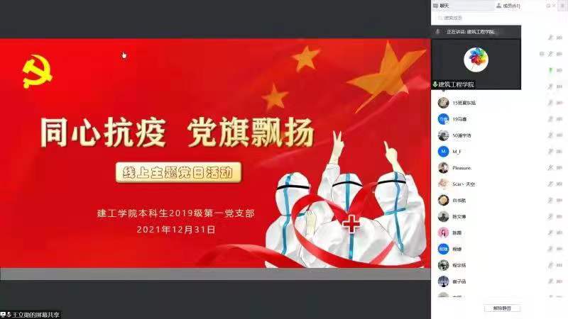 疫情期间,支部对党员和积极分子的培养也并未松懈。2021年12月31日,2019级第一党支部开展“同心抗疫,党旗飘扬”线上主题党日活动,共同收看国家主席习近平的新年贺词,回顾这一年来的付出与收获,共同学习伟大抗疫精神,从抗疫斗争中凝聚精神力量,思政班主任陈英分享学院教职工志愿者抗疫背后的故事,彰显同舟共济、守望相助的家国情怀。1月1日,2019级第二党支部开展“青春在战疫中绽放”线上特别主题党日活动,深入学习贯彻习近平总书记关于疫情防控工作的重要指示精神,赵玺、王牧佳、唐柯靖等党员志愿者分享志愿服务体会与感悟,志愿者贾祎恒说,“作为一名学生党员,第一时间响应号召,投入抗疫一线,我感到非常荣耀”。通过特别主题党日活动,提升了支部党员的凝聚力,增强了全体党员打赢疫情防控阻击战的信心。