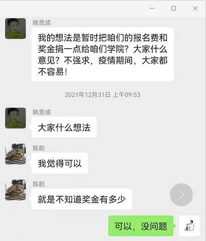 2019级党员志愿者张一涵谈到:“以前只在新闻中看到抗疫一线工作和涌现出的先进典型,这次当自己亲历其中,才真正体会到医护人员的艰辛、老师们的不易以及同学们的团结,这笔奖金捐赠学校,是团队共同做出的决定,希望它能够发挥最大价值。作为青年党员,就应该到党和人民最需要的地方去贡献自己的力量,紧要关头,必须站得出来、顶得上去。”