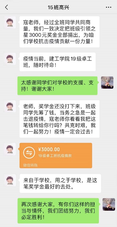 星火成炬,在疫情防控的攻坚时刻,2019级学生党员高兴作为2019280115班长,提出将所获“班级引领之星”奖学金全额捐出,支援学校抗疫,提议一出,立刻得到全体同学支持,受疫情影响,奖学金暂未发放,高兴、张亚茹、马颖、谭志坚、刘长慧5名党员主动拿出自己生活费,第一时间将3000元钱捐赠学校。支部成员张一涵、姚思成、陈航组建的“砼心协力”科创团队,也将全国大学生数学建模竞赛所获一等奖1000元全部捐出,支援此次学校疫情防控。涓涓细流汇聚起众志成城、共克时艰的磅礴力量,他们用实际行动彰显了共产党员在危难时刻的责任与担当。