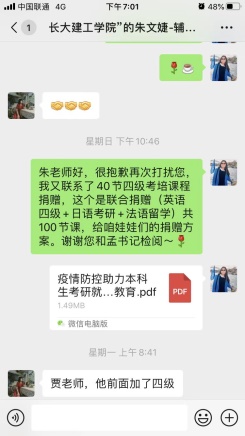 香香漫画 民盟盟员贾能老师利用自身留法十年的学习和工作优势,积极联系西安澎博英语、栖辰小语种教育等校外培训机构,进行本科生英语四级和日语考研等线上课程的捐赠:含40课时(20次)的免费大学四级课程,30课时的日语及30课时的法语免费课程,共计100课时。旨在引导我校学生有效利用疫情封控期间的闲暇时光,以良好的心态打赢这场防疫攻坚战,增强学生的外语就业竞争力,提升学生综合能力。本次捐赠课程将帮助学校学生积极渡过封控难关,借助趣味性的外语学习缓解因疫情而产生的心理问题和情绪困扰,适时调整心理状态,缓解心理压力,提高学习效率,助力人才培养,共同守护美丽校园!
