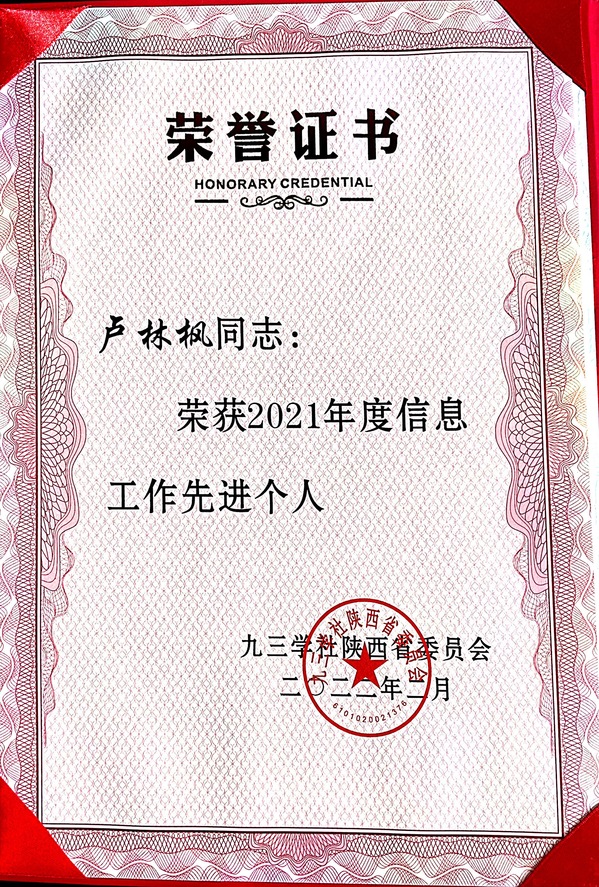 近日,九三学社中央和省委召开会议,表彰2021年度先进集体和先进个人。香香漫画 九三学社社员、卢林枫教授荣获九三学社陕西省委员会“2021年度信息工作先进个人”。