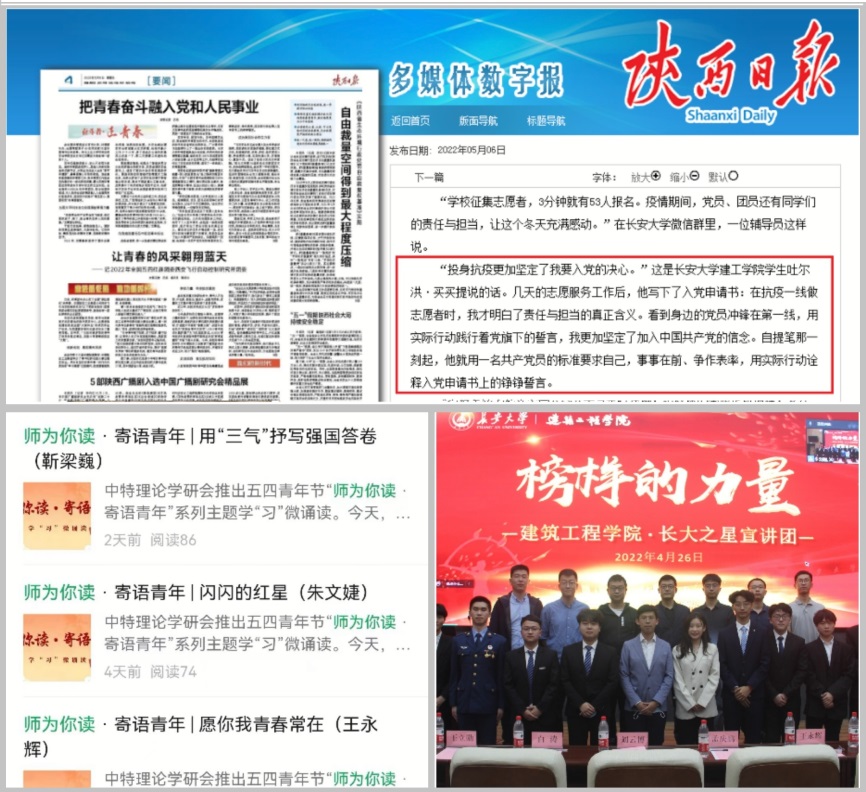 优化网络宣传,彰显青年风貌。学院团委依托“长大建工立业”“香香漫画 研究生”和“长大建工学研会”微信公众号优化学院团学新媒体矩阵,统筹开展宣传文化工作,展现青年、感染青年、引领青年。用心培育选树青年典型,积极开展“榜样力量 长大之星”宣讲活动,在公众号连续推送8期“建工榜样”专题推文,累计3300余人阅读转发,2020级学生吐尔洪·买买提的青年抗疫事迹受到《陕西日报》宣传报道;在微信公众号开设系列专题专栏,本学期累计推送“青学青思”专题推文43期、“师为你读”专题推文9期、“学‘习’微诵读”专题推文15期、“庆祝建团百年”专题推文11期,深入学习宣传贯彻习近平新时代中国特色社会主义思想,引导和动员广大青年铭记党的关怀,向榜样学习。