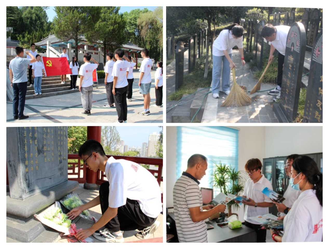 青山有幸埋忠骨,碧血丹心照后人。在庄严肃穆的革命烈士纪念碑前,实践队员们怀着崇敬的心情,向长眠于此的革命烈士鞠躬并献上纪念鲜花,向先烈们表达最崇高的敬意。实践队党员在纪念碑前,面对鲜红的党旗,重温入党誓词。随后,实践队员们自发的拿起扫帚、抹布等工具,为烈士纪念碑抹去尘土,扫去落叶,用实际行动缅怀革命先烈。