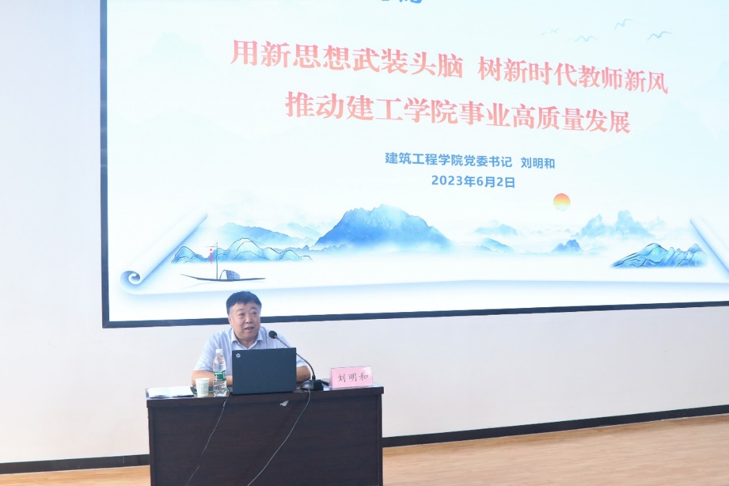 刘明和在为学院主题教育领导小组全体成员、全体教工党员、各系室主任、副主任、民主党派代表讲课时从“深入学习习近平关于教育、科技的重要论述,用新思想武装头脑”“将党的理论转化为实际行动,树立新时代教师良好道德风尚”“走深走实主题教育,推动学院事业高质量发展”三个方面进行了论述,强调要深入学习贯彻习近平新时代中国特色社会主义思想,深刻领悟“两个确立”的决定性意义,增强“四个意识”、坚定“四个自信”、做到“两个维护”,以高度的政治自觉、饱满的政治热情、严肃的政治态度投身主题教育,把主题教育焕发出来的学习、工作热情转化为树立良好师德师风的强大动力,转化为攻坚克难、干事创业、推动学院高质量发展的强大动力。刘明和希望广大教师要不忘初心,做“四有”好老师;担当使命,做到“四个”相统一;以生为本,做好“四个”引路人;立德修身,要成为大先生。