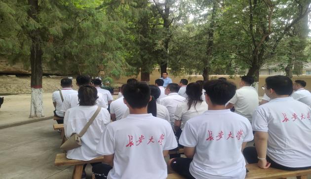 实践队与同行队伍在杨家岭旧址前合影留念           实践队听前辈老师讲党史