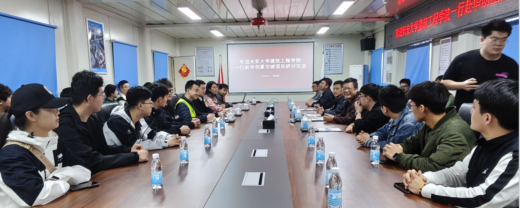学生们参观了华创星空城项目。本项目总建筑面积达19.9万平米,涵盖三栋主塔楼和两栋裙楼,集办公及商业于一体。在进行实地参观时,现场讲解人员介绍了工程的亮点做法,如工具式一体化防护门、工具式悬挑防护棚等。现场参观结束后,学生们返回会议室,项目技术人员从建筑行业发展、装配式建筑相关知识、工程造价专业学生发展前景、目前光伏等领域普及等方面与学生们进行了充分交流。