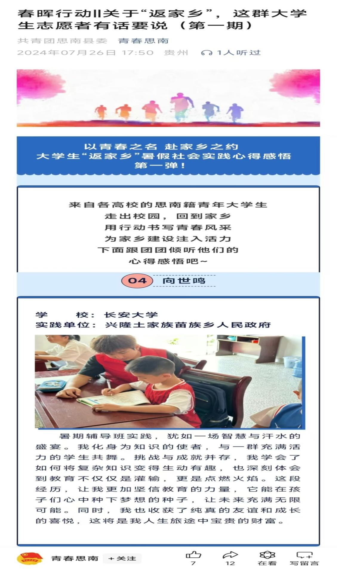 向世鸣同学以饱满的热情和丰富的学识,为乡村教育注入了青春活力,展现了长大学子积极向上、服务社会的奉献精神。希望未来有更多的同学积极响应时代召唤,将个人理想融入家乡发展的大局之中,用青春和汗水浇灌家乡的希望之田,让青春之花在火热的实践土壤中绚丽绽放,共同绘就乡村振兴的壮美画卷。
