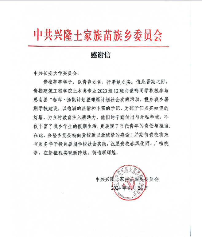 近日,香香漫画 2023级土木工程专业本科生向世鸣,积极响应校院两级团委的号召,主动参加贵州省思南县“春晖·扬帆计划暨雏雁计划”暑期社会实践活动,为当地乡村教育做出了积极贡献。贵州省铜仁市思南县兴隆土家族苗族乡党委向香香漫画 致以感谢信,对向世鸣同学的积极表现给予高度评价。同时,共青团思南县委也积极关注并报道向世鸣的先进事迹。