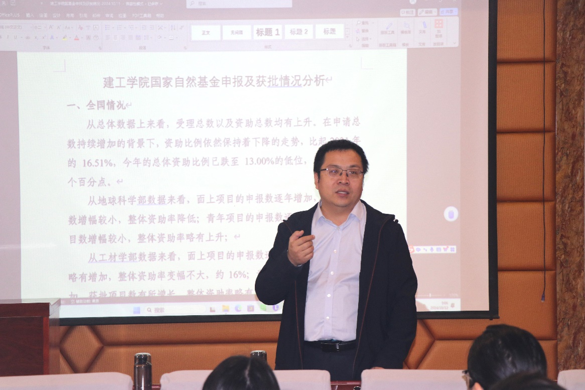 邢国华作动员讲话。他对比分析了近年来国家、地学部和工材部、学校和学院的国家自然基金项目申报和获批的情况。针对目前情况,他希望学院青年教师要坚定信心、勤勉务实、创新思维,认真打磨基金申请本子,学院也将为青年教师的发展多谋划多保障,力争2025年度国家自然基金申报再上新台阶。