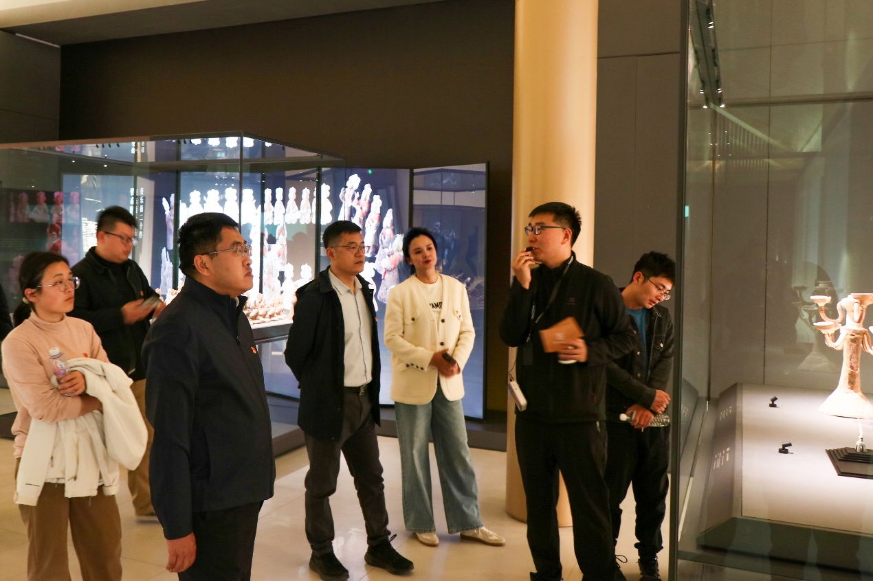 学院党委一行随后走进西安咸阳国际机场博物馆开展文化研学。“一座洪渎原,半部中国史”——这座坐落于周秦汉唐文明核心区的博物馆,以独特视角串联起千年时空。在讲解员的引导下,学院党委一行驻足观摩馆中展陈文物。通过聆听考古发现与机场建设中的文物保护案例,学院党委一行深刻领略到现代基建与文化遗产保护“共生共荣”的实践智慧,感受到历史文脉源远流长的厚重力量。