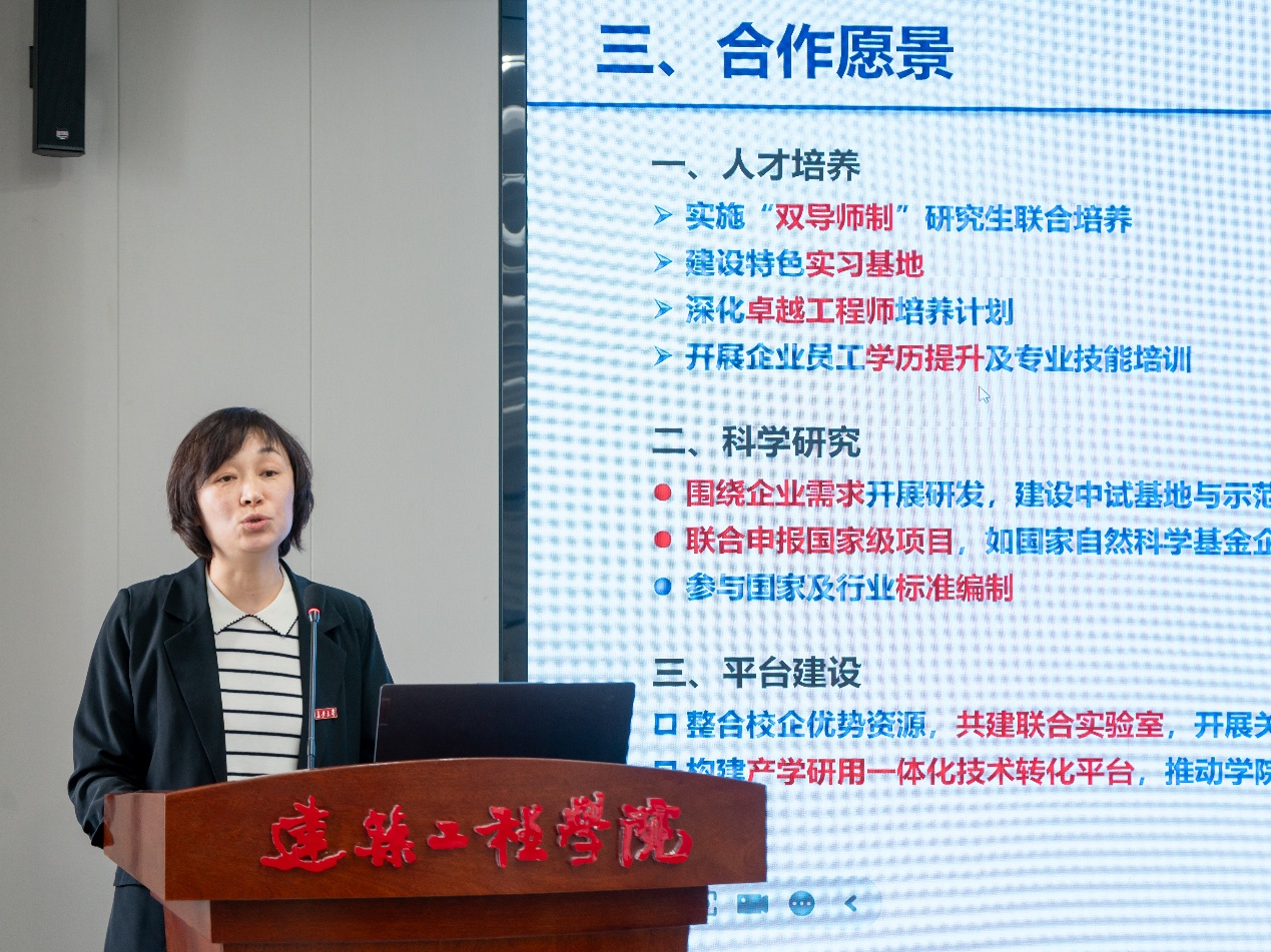 学院副院长赵晓红详细介绍了学院科研团队建设、重点研究方向及主要成果应用情况、校企合作愿景。她指出,学院目前已在土木工程、市政工程、土木工程+能源等方向形成特色优势,承担了一批国家级和省部级重要项目,但目前发展仍面临诸多困难与挑战。她表示,学院将以服务国家重大战略为导向,深入推进有组织科研,促进产学研用,希望在校友共同支持下,加快推动学院科研提升与高质量发展。